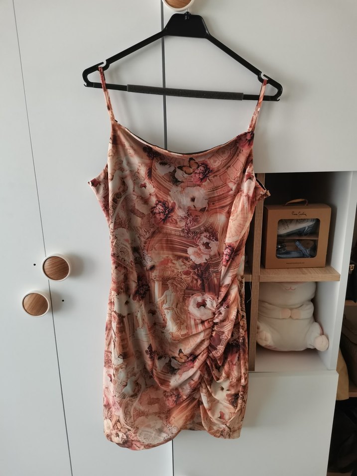 Askılı, drapeli ve bej tonlarında batik desenli midi boy, vücuda oturan elbise, yumuşak sentetik kumaştan.