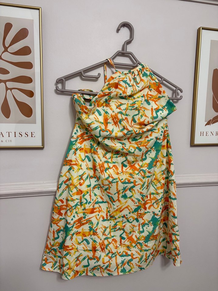 Askılı, drapeli, straplez yaka ve bol kesimli mini hamile tuniği. Hafif, çok renkli batik desenlidir ve günlük kullanım için uygundur.