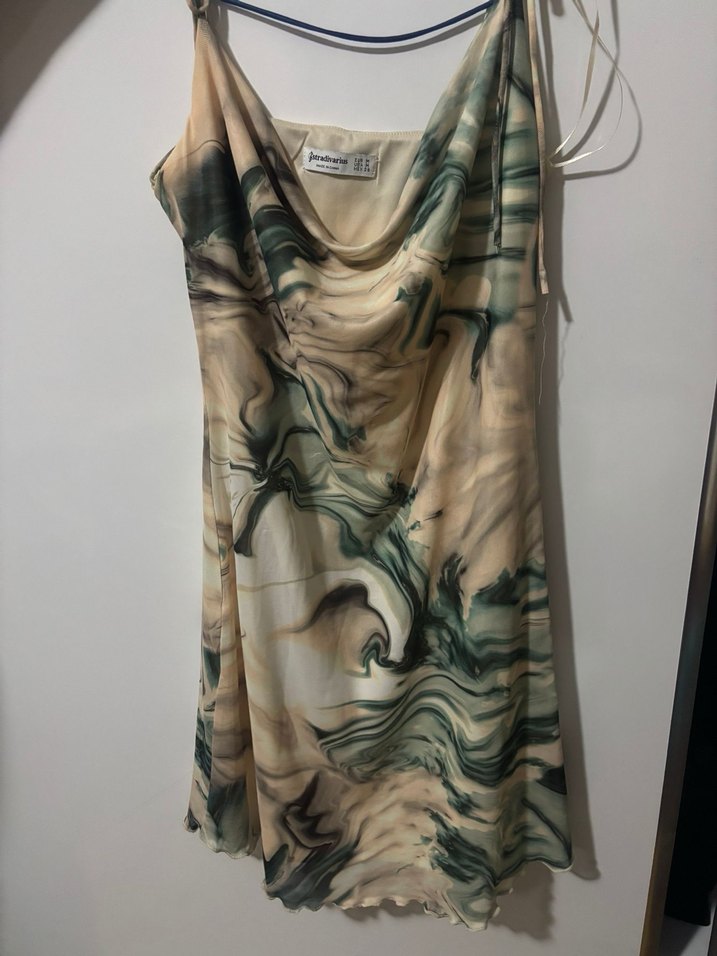 Bej ve gri bağlamalı desenli, askısız, drapeli yakalı ve vücuda oturan mini elbise, dış mekan etkinlikleri için uygundur.