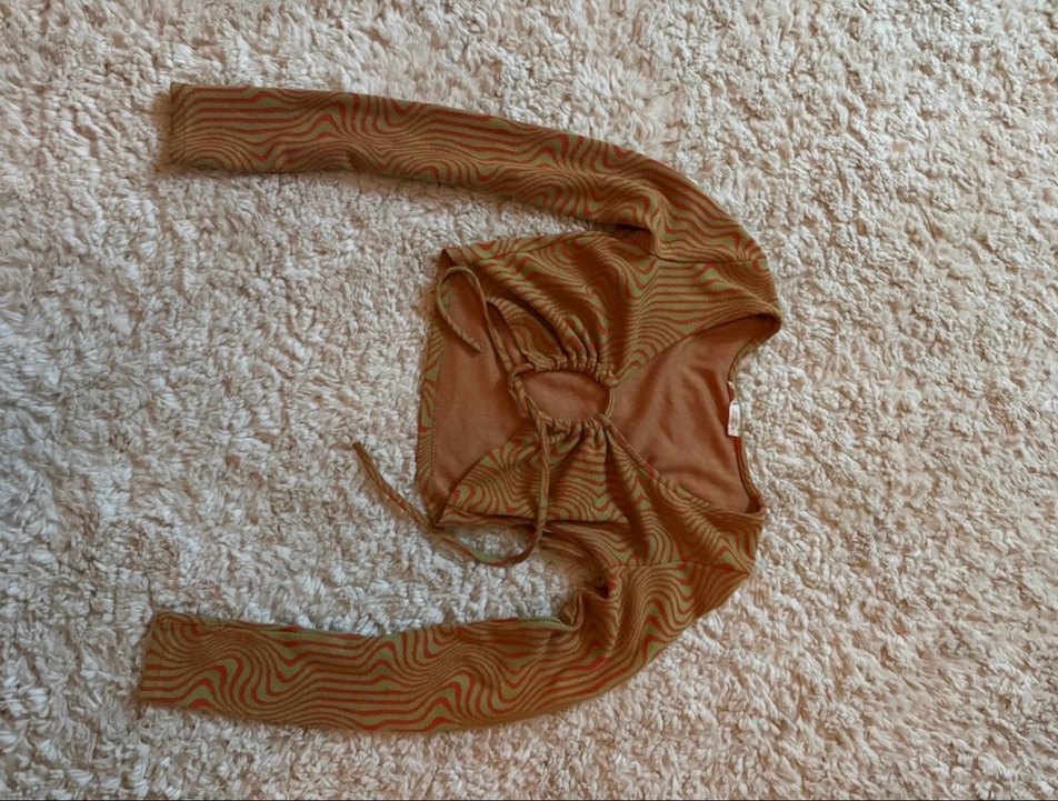 Kahverengi, parlak tie-dye desenli, uzun kollu ve kayık yaka dar kesim bluz. Bağcıklı, drapeli ve bohem tarzda rahat bir modeldir.