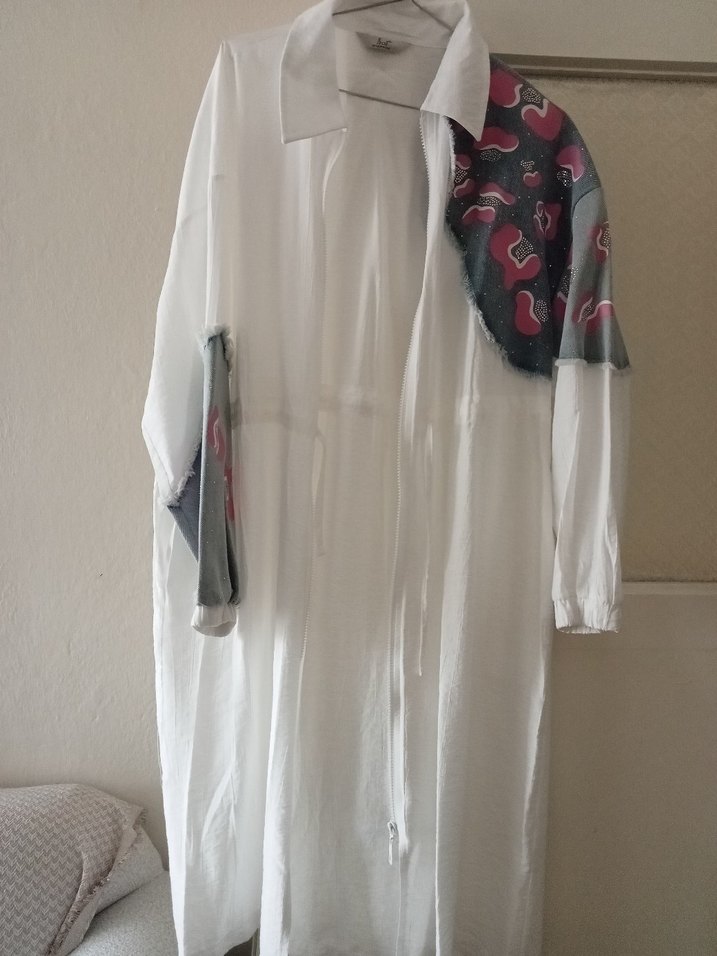 Drapeli ve bağcıklı uzun beyaz kadın kimonosu, yakalı ve uzun kolludur. Gri ve pembe tonlarında batik desenlidir, bol kesimdir. Yumuşak kumaştan üretilmiş, günlük kullanıma uygundur.