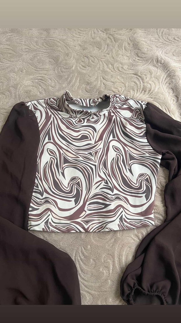 Yüksek yakalı, bol kesim ve drapeli tasarıma sahip uzun kollu bluz. Önü bağlama desenli kahverengi, kolları düz kahverengi, yumuşak sentetik kumaşlı. Günlük sokak stiline uygun.