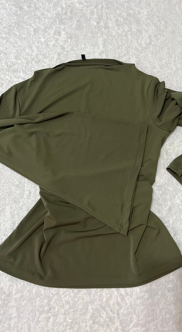 Bu haki bluz, drapeli tasarımı, balıkçı yakası ve uzun kollu, uzun kesimiyle dikkat çeker. Yumuşak sentetik kumaştan üretilmiştir, sade ve normcore tarzındadır.