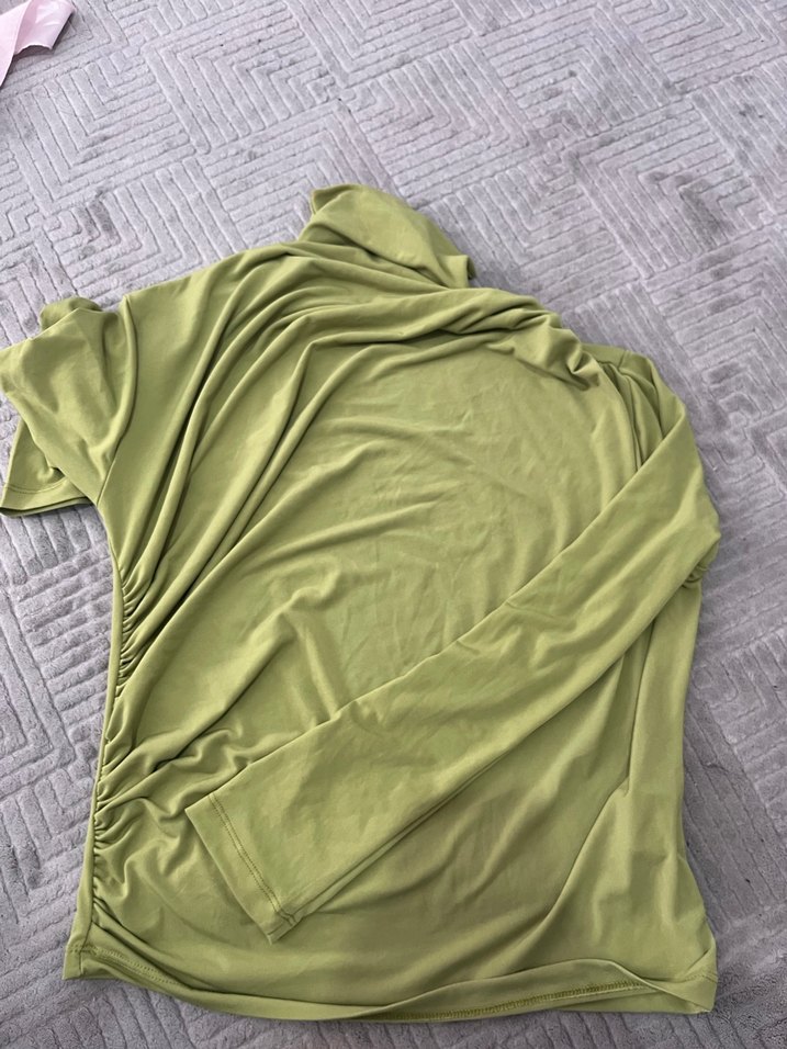 Drapeli, balıkçı yaka ve uzun kollu, kadınlar için khaki renkli, yumuşak keten kumaştan yapılmış, normal midi boyda, dar kesim bluz.