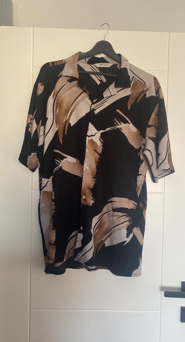 Drapeli tasarıma sahip, kısa kollu, bol kesim erkek gömlek. Sentetik kumaştan, koyu kahverengi baskılı desenli, günlük kullanıma uygun.