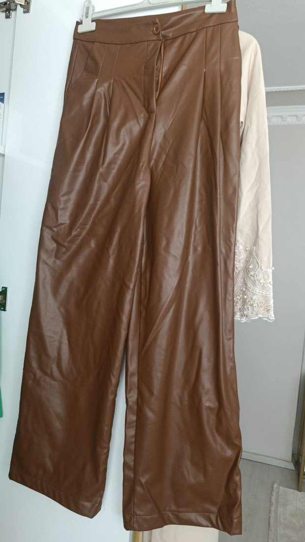 Drapeli tasarıma sahip koyu bej deri pantolon, rahat kesimiyle ofis ve gündelik şıklık için uygundur.