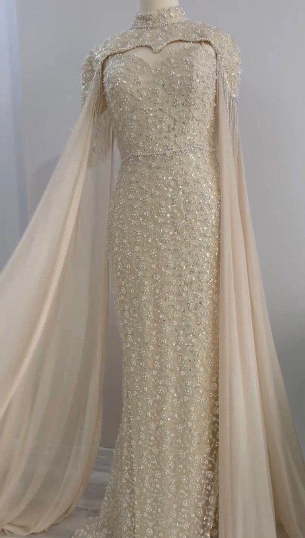 Drapeli Bej İşlemeli Uzun Abiye - Görsel 1