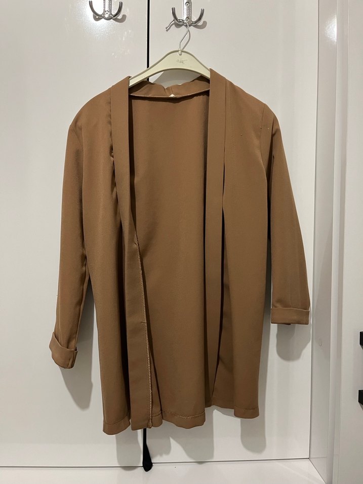 Drapeli tasarıma sahip koyu bej renkte, normal boy midi uzunluğunda, uzun kollu kadın blazer ceket. Sentetik kumaştan üretilmiştir ve rahat kesimdir.
