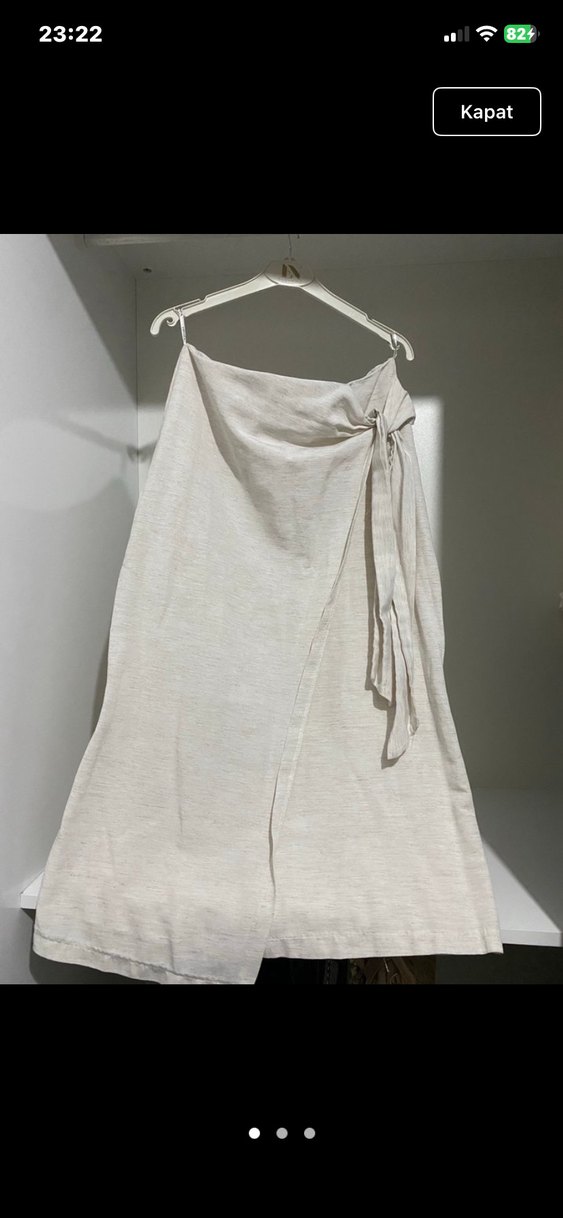 Bej renkte, keten kumaştan yapılmış, drapeli ve bol kesim midi uzunluğunda kadın eteği. Minimalist ve bohem tarz için uygun.