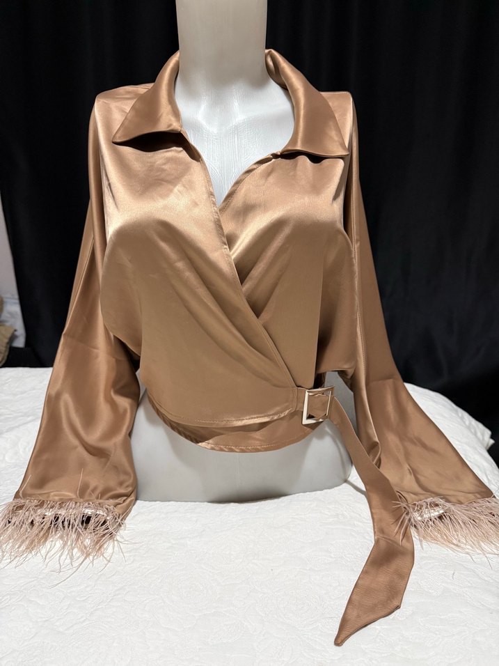 Bej saten kumaştan, drapeli ve kuşaklı, uzun kollu, tüy detaylı kadın bluz. Straplez yakalı, modern ve iddialı tarzda.Ürün bir kez bile giyilmedi,etiketi batıyor diye kesmiş bulundum ama pahalı bir markanın buluzu,şık ve dikkat çekici bir parça,benzer renkte ve kumaşta bir gömleğim daha var bu yüzden satışta