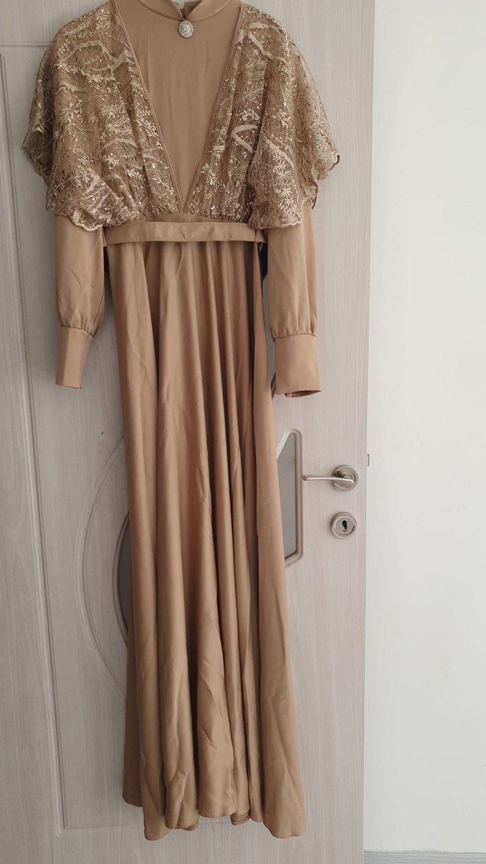 Bej renkli, drapeli uzun abiye elbise, uzun kollu ve V yakalıdır. Bol kesim ve parlak dokusu ile düğün için uygundur.