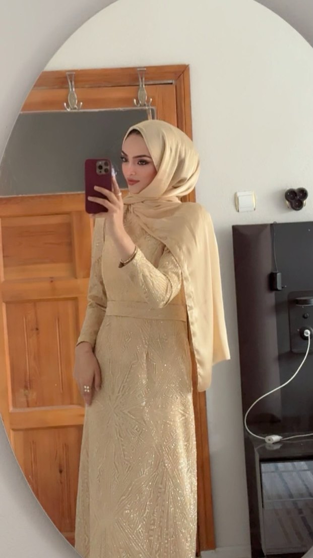 Bej renkte, drapeli uzun abiye elbise. Yüksek yakalı, uzun kollu ve etnik desenlidir. Düz kesim, düğün için uygundur. ✨