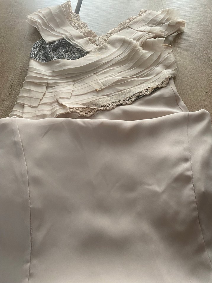 Drapeli ve kayık yaka kesime sahip, kolsuz ve vücuda oturan uzun bej abiye elbise. Düğünler için modern klasik tarzda, hafif gri detaylarla tamamlanmıştır. Teklif kabul ediyorum