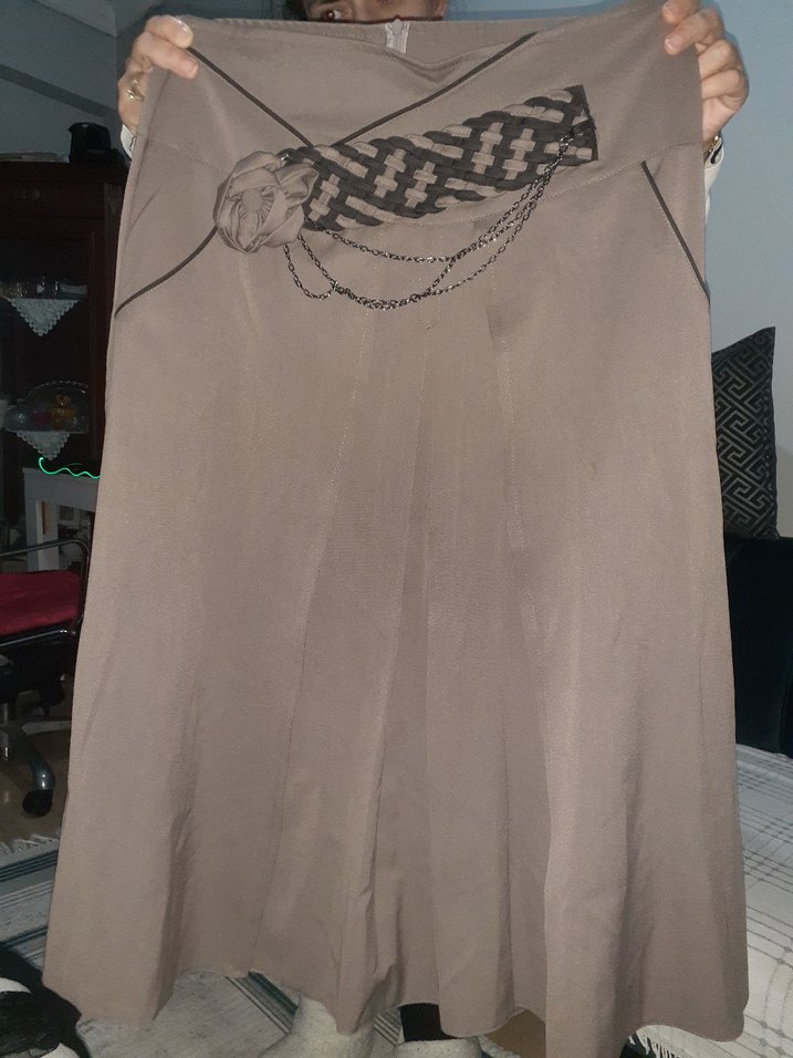 Bej renkli uzun keten etek, bol kesim ve drapeli detaylara sahip, baskılı desenli rahat bir tasarım sunar.