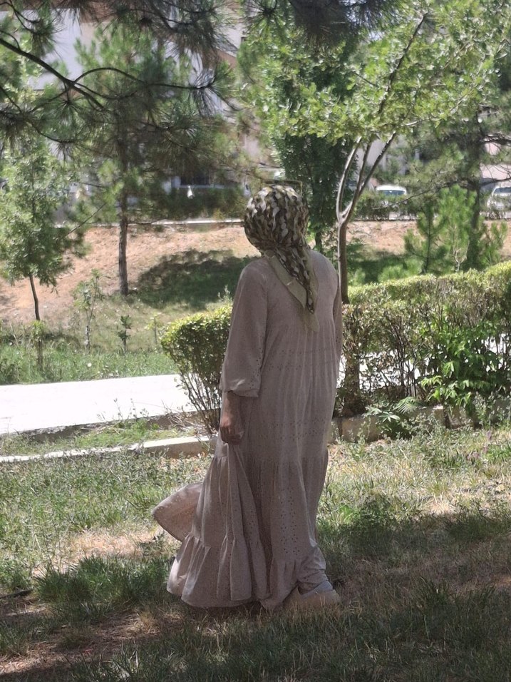 Bej renkli, keten kumaştan yapılmış, drapeli ve bol kesimli uzun elbise. Yüksek yakalı ve askılı kollarıyla bohem ve retro tarzda, açık hava kullanımı için uygun.