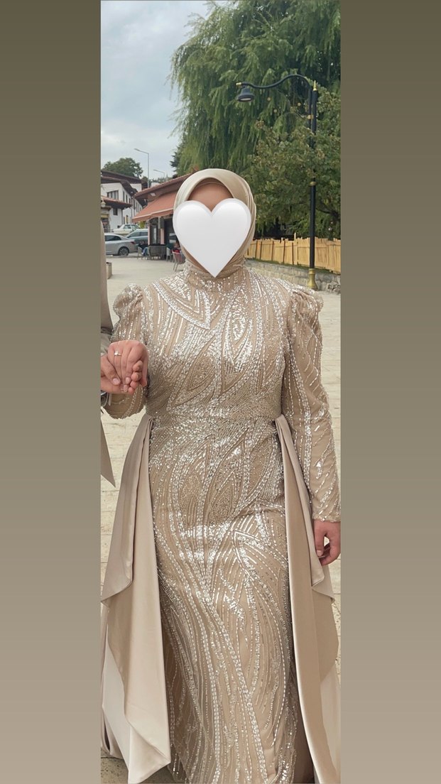 Fitted kesim, uzun bej nişan elbisesi yüksek yakalı ve etnik desenlidir. Uzun kollu ve şık drapeli detaylara sahiptir, düğün için uygundur. ✨