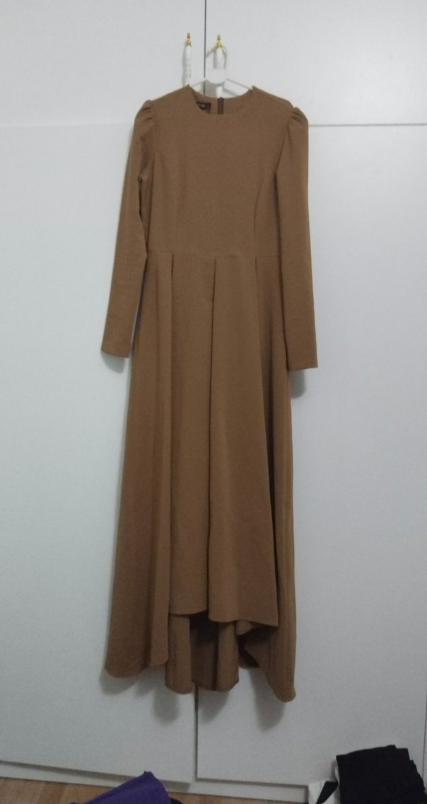 Koyu bej renkli bu uzun elbise, drapeli tasarımı, yüksek yakası ve uzun kollarıyla sade ve modern bir görünüm sunar tesettüre uygundur