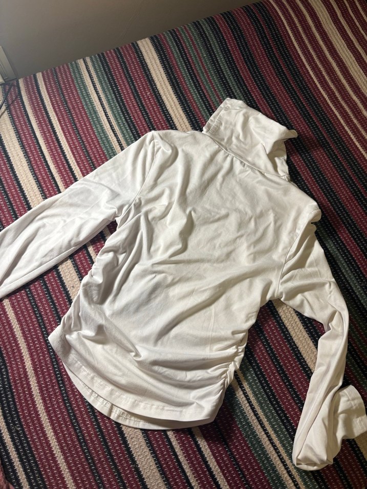 Beyaz balıkçı yaka ve uzun kollu, drapeli bluzu. Keten kumaştan, normal midi boyunda, günlük sokak stili için uygun.