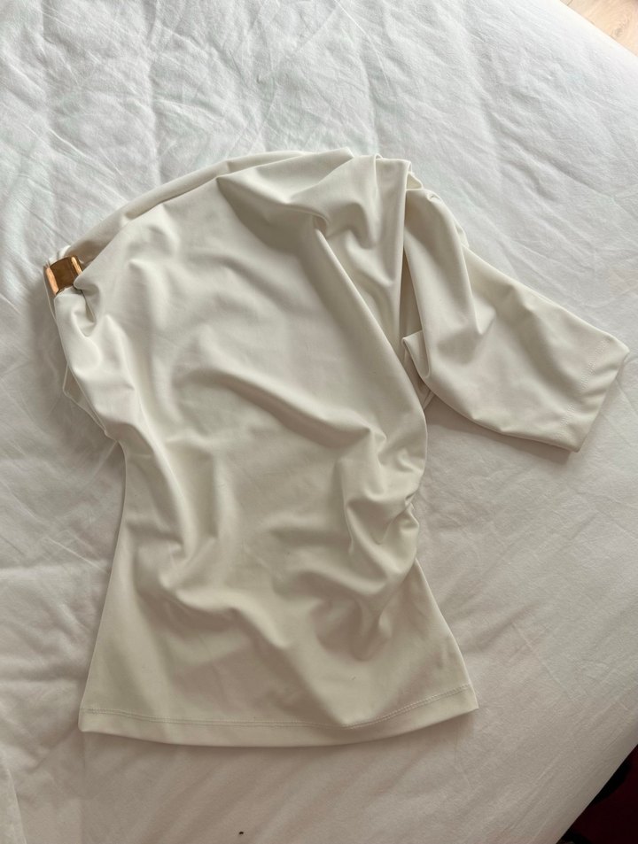 Beyaz renkte, kısa kollu, drapeli ve yüksek yakalı kadın bluz. Gevşek kesimi ve midi boyuyla günlük kullanıma uygun, sentetik kumaştan üretilmiştir.
