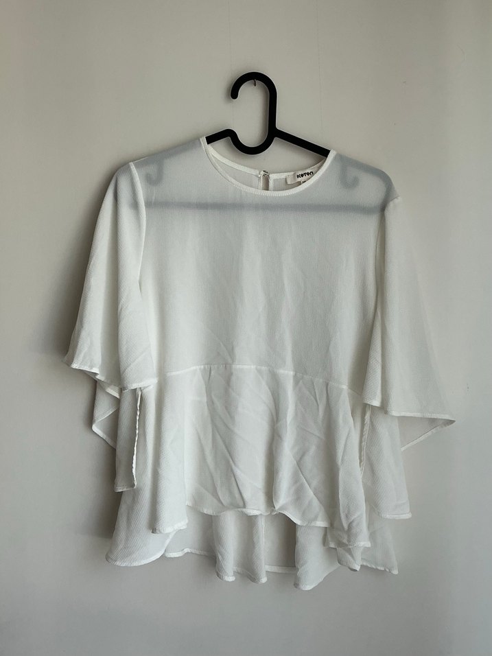 Drapeli tasarımı, kısa kollu ve keten kumaşıyla beyaz kadın bluz, günlük kullanıma uygundur.