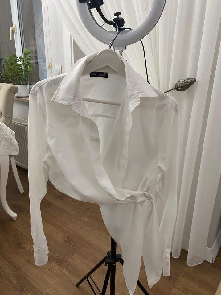 Beyaz keten kumaştan, drapeli tasarıma sahip, yakalı ve uzun kollu kadın gömleği. Normal kesim ve midi boyda, ofis için çağdaş Paris tarzı.