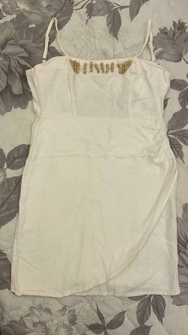 Keten kumaştan, drapeli ve ince askılı , kısa boy beyaz elbise. Üst kısmında ahşap boncuk detayları bulunan bohem tarzda, fitted kesim elbise.