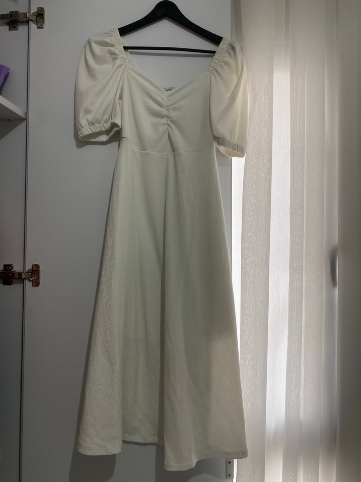 Herhangi bir defosu yoktur.Drapeli beyaz keten uzun elbise, V yakalı ve kısa kolludur. Bol kesim, minimalist ve modern klasik tarzda, düğün için uygundur.