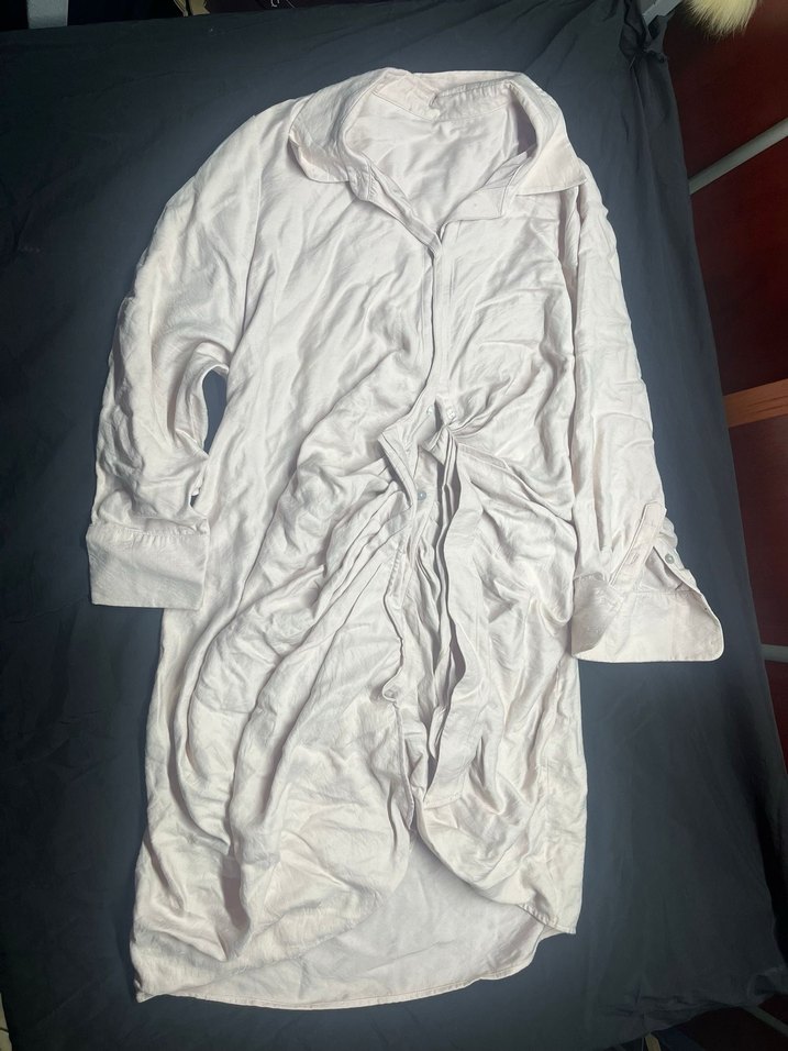 Keten kumaştan, drapeli ve bol kesim beyaz gömlek. Yaka detaylı, uzun kollu ve midi boyda, günlük sokak stili için uygun.