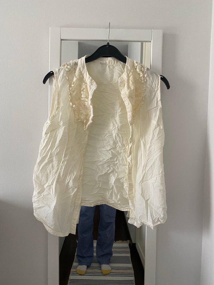 Hafif keten kumaştan, yüksek yakalı, kolsuz, drapeli ve bol kesim beyaz bluzu. Normal midi boyda, desen içermeyen günlük kullanıma uygun.