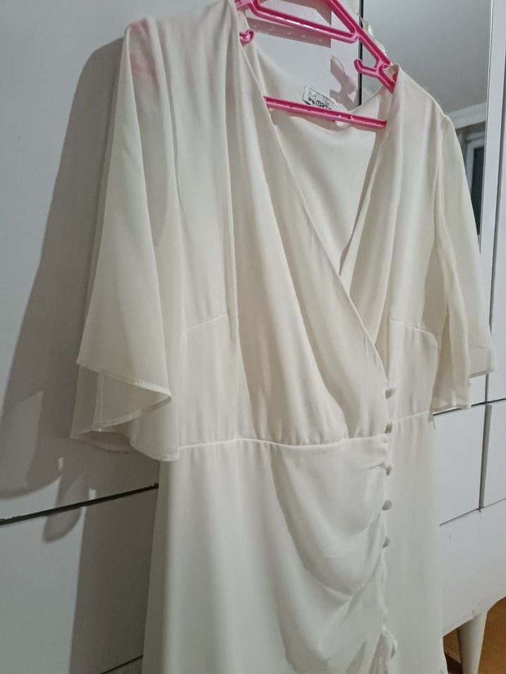 V yakalı, drapeli beyaz, kısa kollu ve bol kesim. Yumuşak sentetik kumaştan, bohem ve Paris tarzında özel günler için uygun. Sadece bir geceliğine giydim. sonrasında kilo verdiğim için giyemedim. Ürün sıfır kalitesinde
