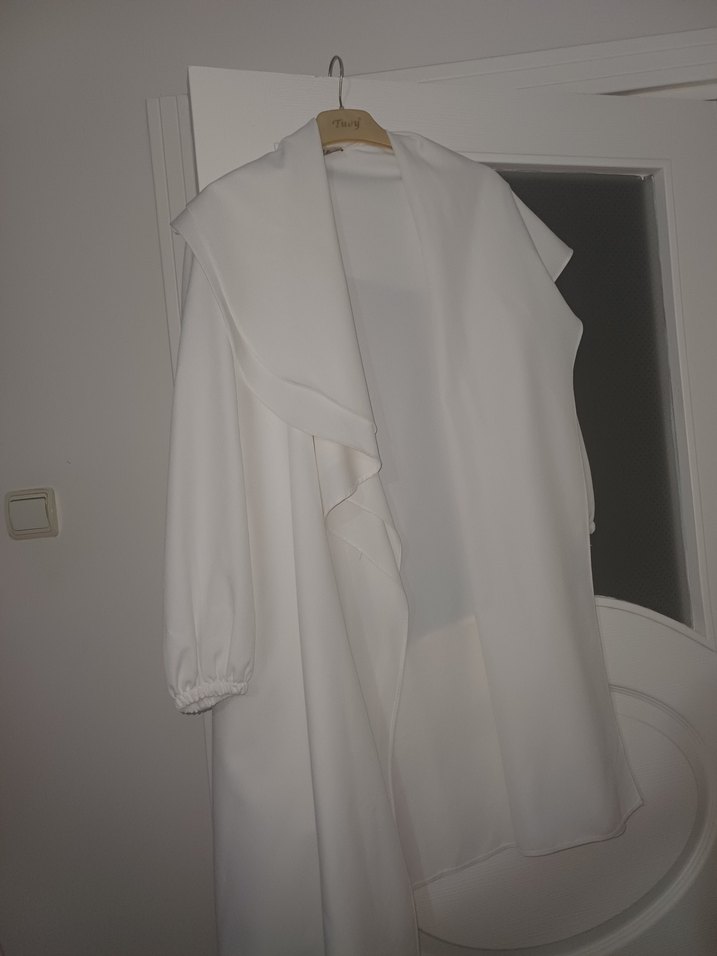 Beyaz keten dokulu, drapeli, uzun kollu, notched lapel yakalı, bol kesim midi boy ceket. Paris tarzı sokak modası için uygun, günlük kullanımda rahat.