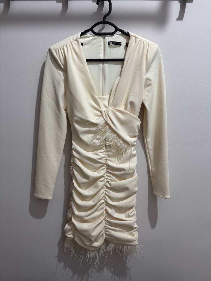 Drapeli, vatkalı V yakalı krem mini elbise, uzun kollu ve vücuda oturan bir kesime sahiptir.✨Otrişler ve yakadaki parça sonradan eklenmiştir. Çıkartılabiliyor. Nişanımda giydiğim bir parça.