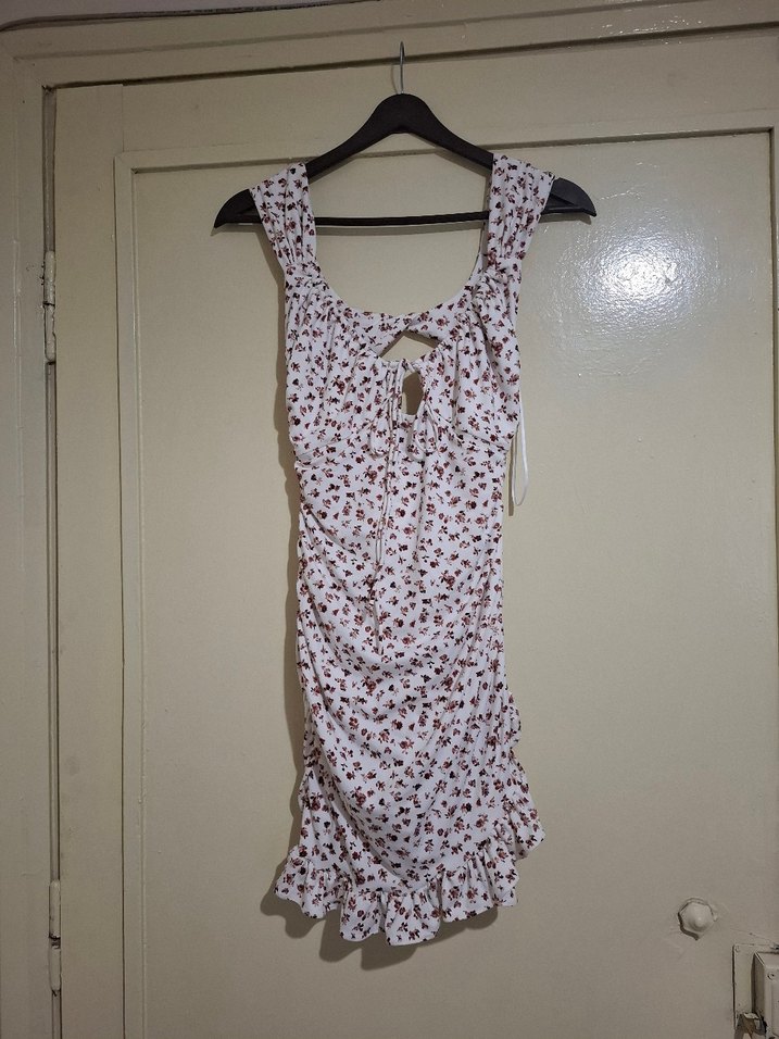 Kolsuz, v yaka, drapeli beyaz mini elbise. İnce kesimi ve hafif batik desenleriyle günlük rahat sokak stiline uygundur.