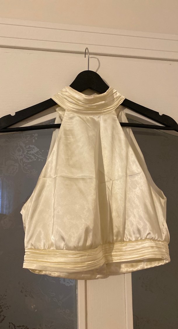 Yüksek yakalı, kolsuz ve drapeli detaylara sahip, parlak beyaz kumaştan yapılmış, klasik ve bohem tarzda midi elbise.