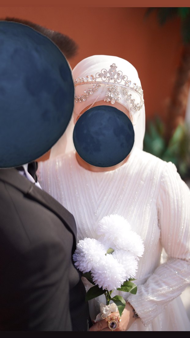 Beyaz drapeli tesettür, kristal işlemeli zarif bir gelin tacıyla tamamlanmıştır. Sadece 1 saat çekim için kullanıldı.