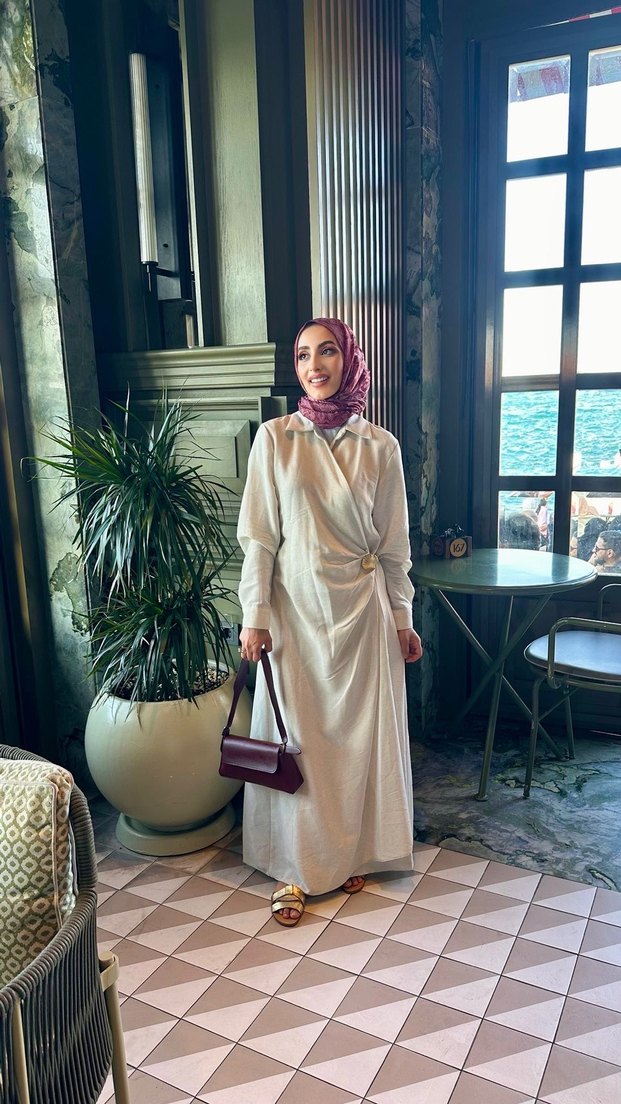 Beyaz, uzun ve keten kumaştan yapılmış, yüksek yakalı ve uzun kollu drapeli elbise. Günlük kullanıma uygun, etnik desenli ve modest kesim.
