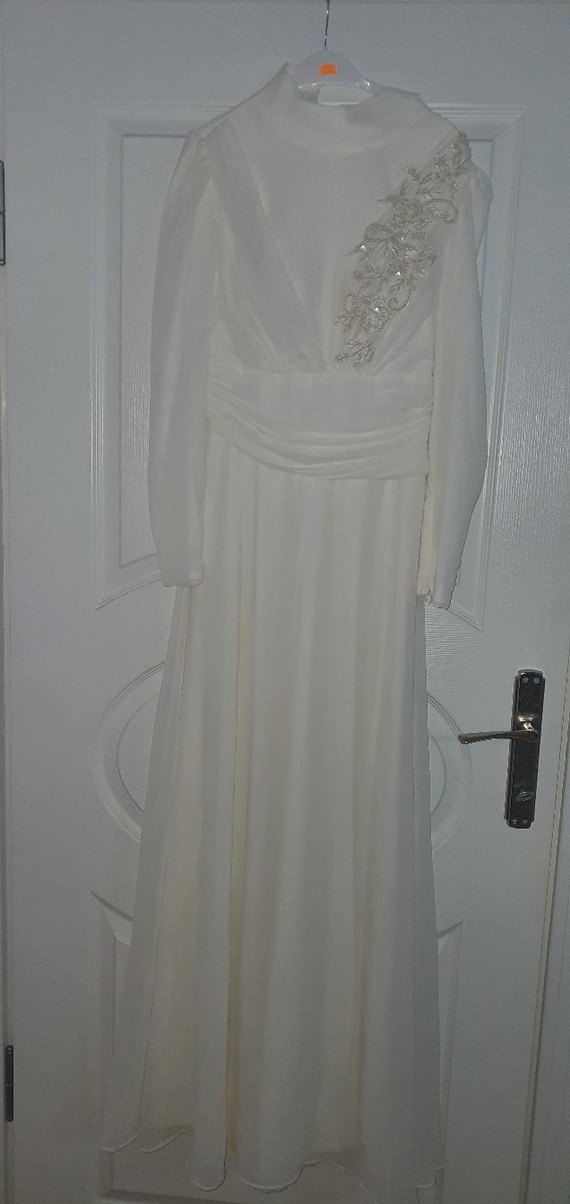 Beyaz renkte, drapeli tasarıma sahip, uzun kollu ve V yaka kadın gelinlik. Gevşek kesimi ve uzun boyu ile klasik ve vintage şıklığı yansıtıyor.