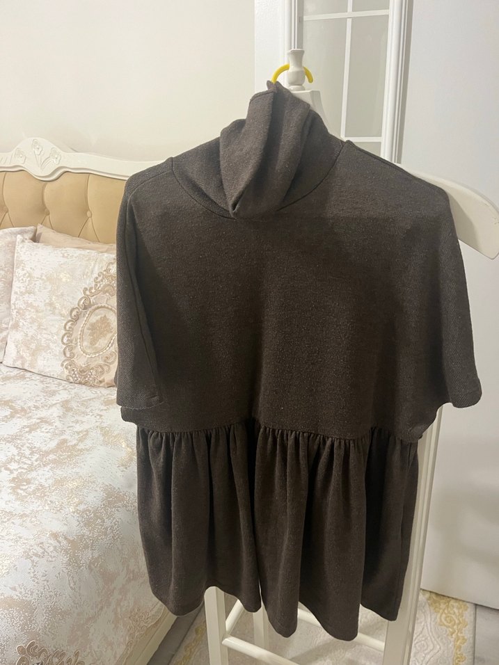 Yumuşak keten kumaştan, bol kesim drapeli boğazlı kısa kollu kahverengi hamile tunik. Midi boyda, günlük kullanıma uygun.