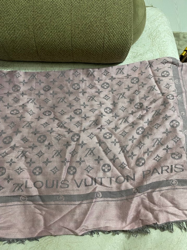 Kadınlar için drapeli, bej renkte Paris esintili Louis Vuitton desenli şal. Yumuşak sentetik kumaştan, bohem ve retro tarzlara uygun. ORJ