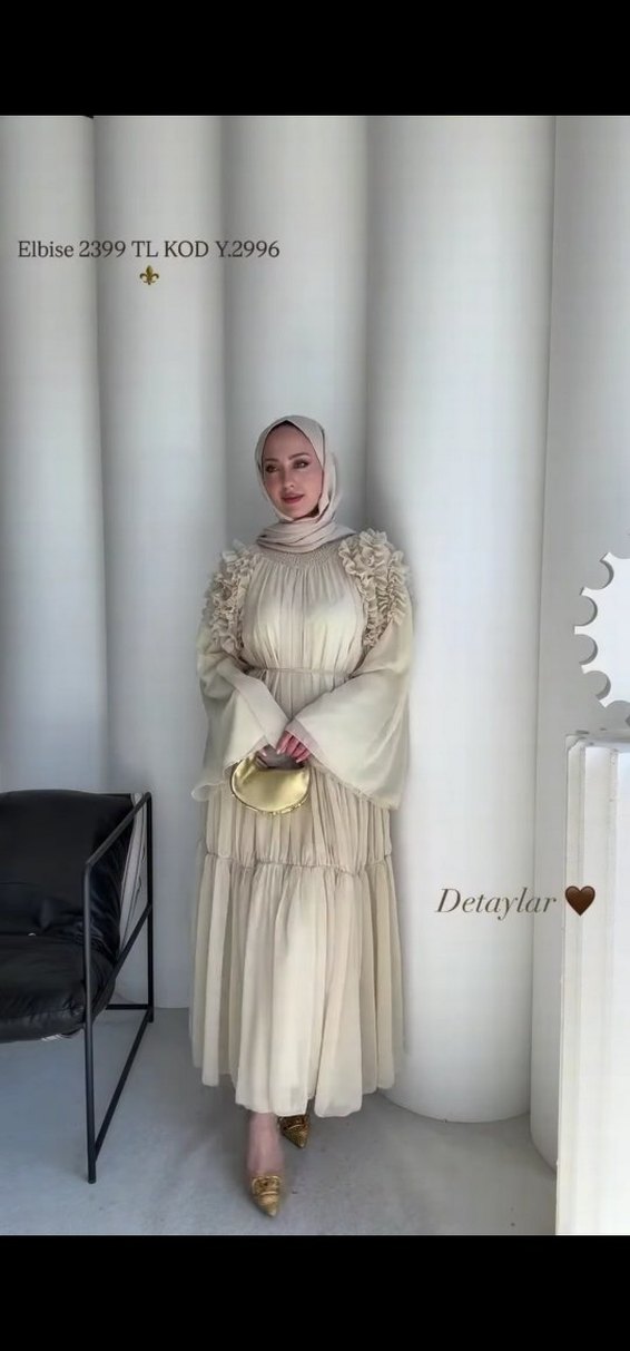 Yüksek yakalı ve uzun kollu, etnik desenli uzun beyaz elbise. Rahat kesim ve drapeli tasarım, yumuşak sentetik kumaştan, düğünler için uygun.