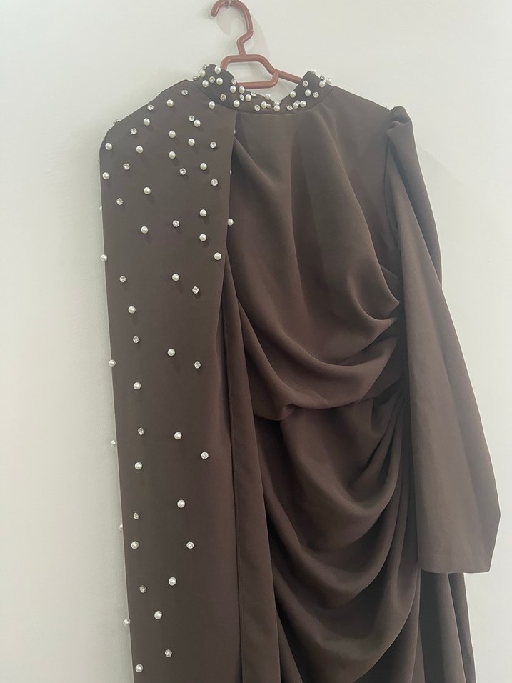 ÜRÜN 44 BEDEN AMA ABİYE OLDUĞU İÇİN 42 BEDEN İÇİN DAHA UYGUN.YANINDA 2,5 M ŞALI İLE BERABER GÖNDERİLECEKTİR.1 DEFA ABLAMIN NİŞANINDA GİYDİM.KURU TEMİZLEME YAPTIRILDI.Uzun kahverengi elbise, drapeli tasarım ve bol kesim ile yüksek yakaya sahiptir. Tek kol boncuklarla süslenmiş, modern ve avangart bir görünüm sunar. Düğün ve özel günler için uygundur.