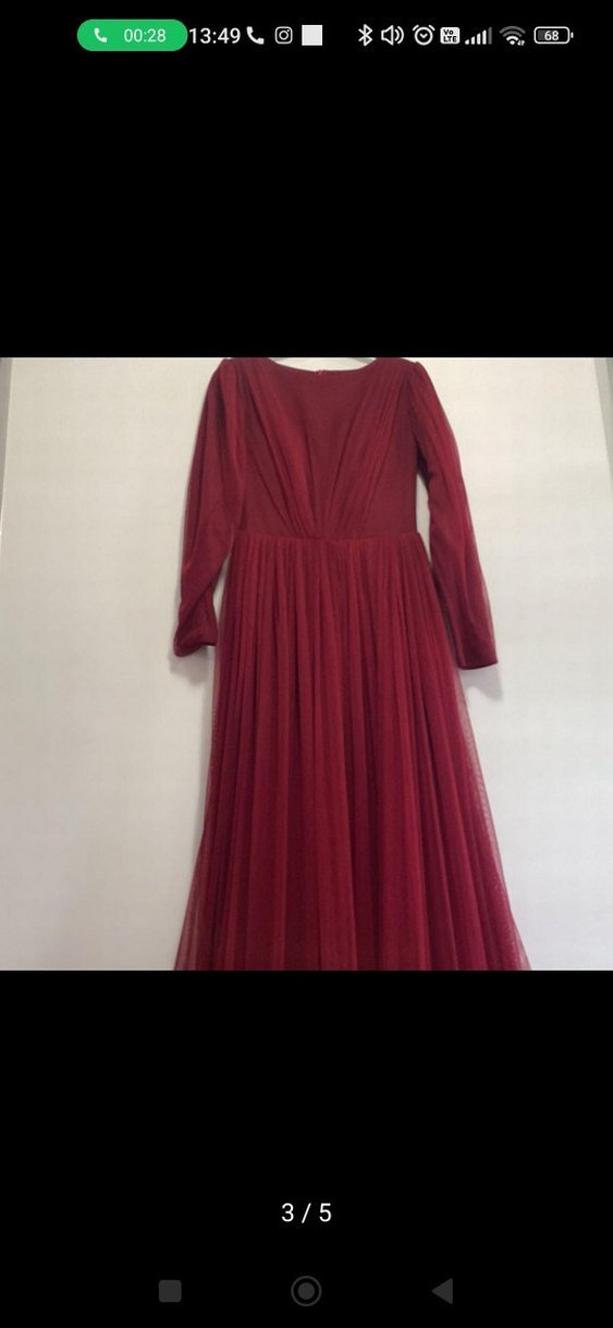 Bordo renkli, drapeli ve tek renkli uzun abiye elbise. Kayık yaka ve uzun kollu, rahat kesim modern klasik tarzda, düğün için uygun.