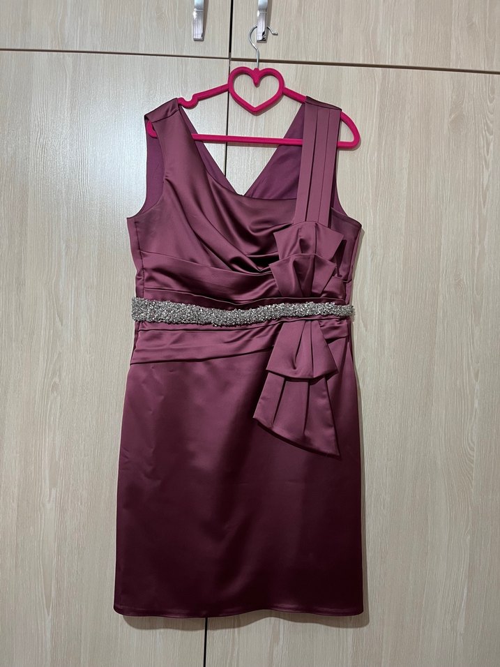 Drapeli V yakalı, kolsuz, bordo midi abiye elbise, belinde süslü detay ile klasik ve şık bir görünüm sunar.