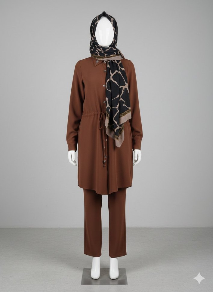 Uzun kesim, regular fit kadın takım elbise, yüksek yakalı ve uzun kollu. Sentetik kumaştan, koyu camel renkli, batik desenli ve drapeli tasarıma sahip, günlük kullanıma uygun.