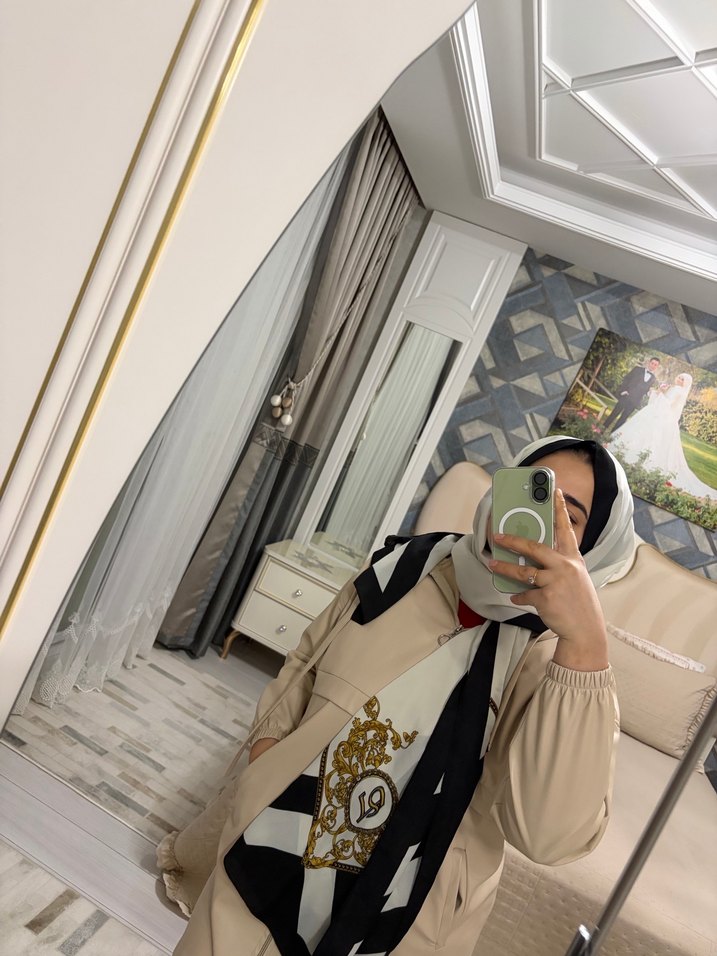Kadınlar için camel renginde, drapeli tasarıma sahip, yumuşak sentetik kumaştan yapılmış şal. Sokak modasına uygun ve mütevazı tarzda.