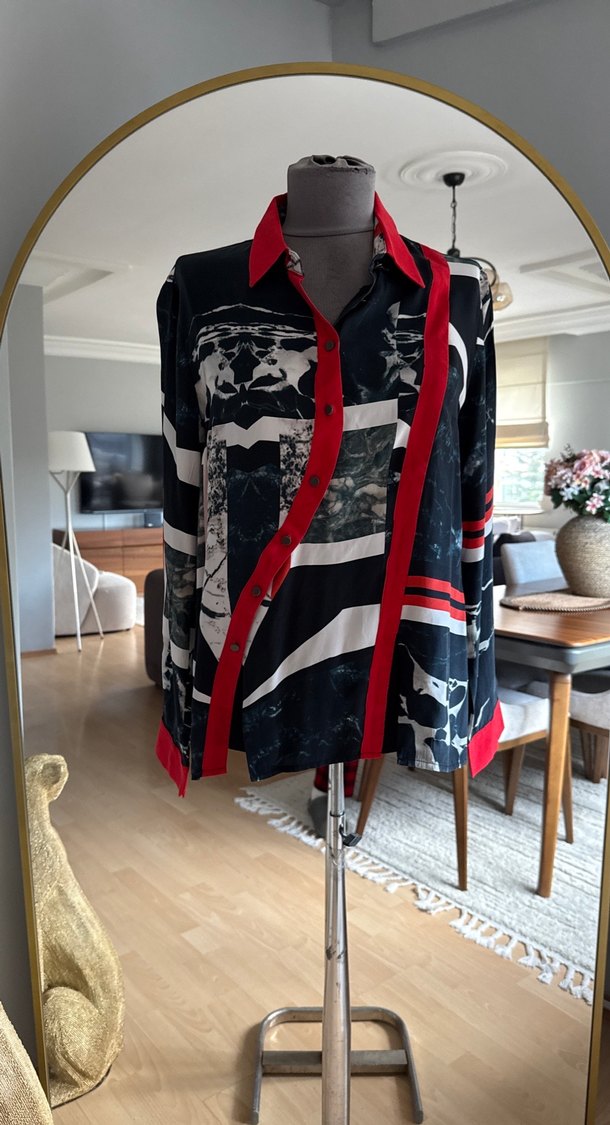 Gri, siyah, beyaz ve kırmızı baskılı desenli, drapeli, uzun kollu, notched lapel yakalı, bol kesim kadın gömlek. Sokak modasına uygun ve günlük kullanıma elverişli.