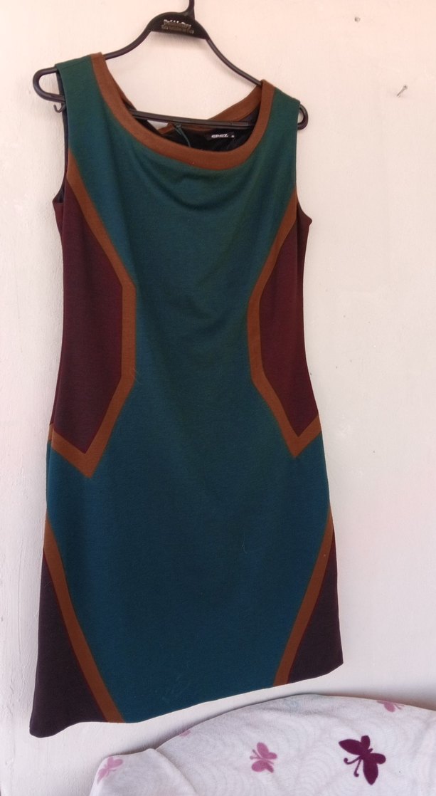 Kolsuz, yüksek yakalı ve vücuda oturan kesime sahip çok renkli desenli triko elbise, drapeli detaylarla ofis kullanımı için uygun.çok giyilmişdir