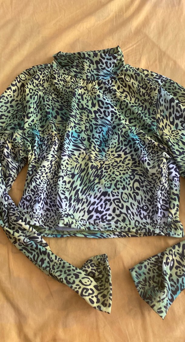 Drapeli, koyu renk tie-dye ve leopar desenli çok renkli bluz, yüksek yakalı ve uzun kolludur, streetwear tarzı sunar.