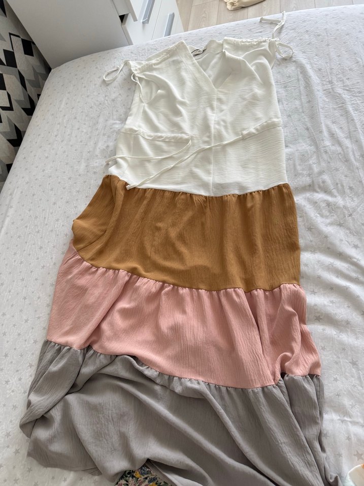 Drapeli, bol kesim, elbise . Pastel çok renkli ve yumuşak sentetik kumaştan, bohem tarzda.