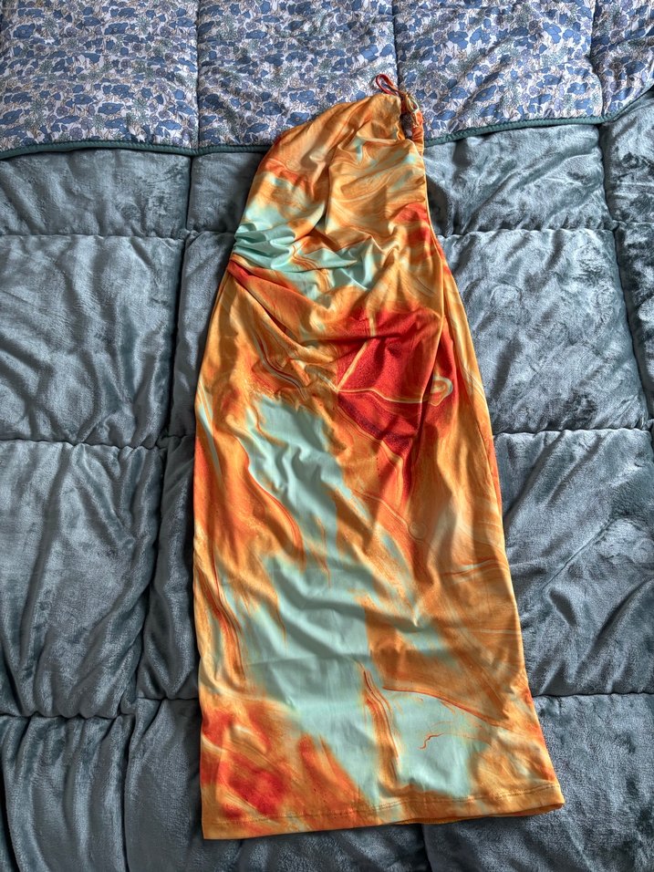 Drapeli Çok Renkli Uzun tek kol askılı Elbise